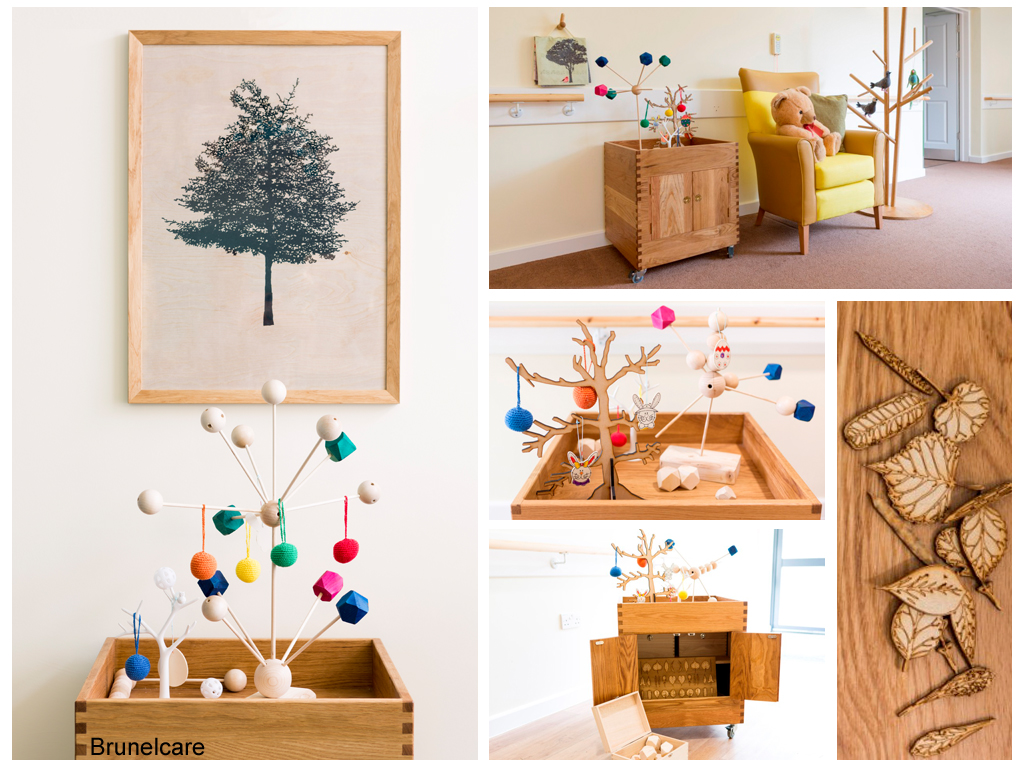 “My project for the interactive commission was to construct four purpose-built movable wooden cabinets, one for each residential unit. The cabinets contain a series of abstract and figurative wooden and woolen objects inspired by research into dementia and dialogue with staff and residents. Staff and residents can work with these multidimensional objects on the tops of the cabinets or the items can be constructed into mobiles for display in resident’s rooms or elsewhere in the building. The cabinets also contain audio playing equipment, which connect wirelessly with headphones and speakers, enabling residents to listen to music, poetry, ambient sounds and audio books." said Eamon.