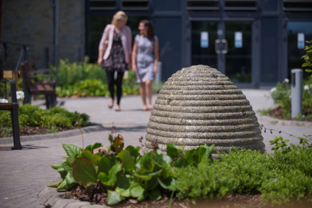 Peter Randall-Page’s sculpted stone water feature for the Medical Day Garden is made from a naturally eroded granite boulder from Dartmoor which he has carved in low relief in a rippling pattern. Water emerges from the top of the sculpture to flow gently over its entire surface. The stone is surrounded by pebbles and subtly lit after dark.
